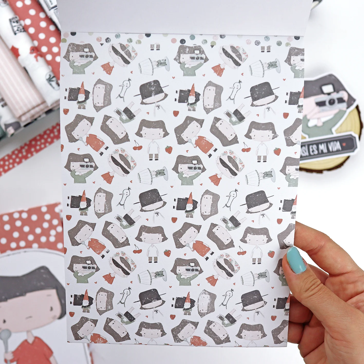El bloc pequeño Destino para scrapbooking está encolado por la parte superior e incluye 24 papeles de scrapbooking impresos a una cara, en 190 gr.
