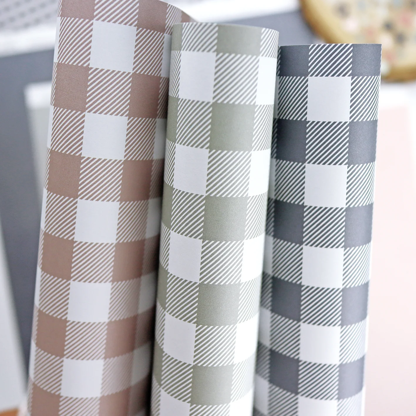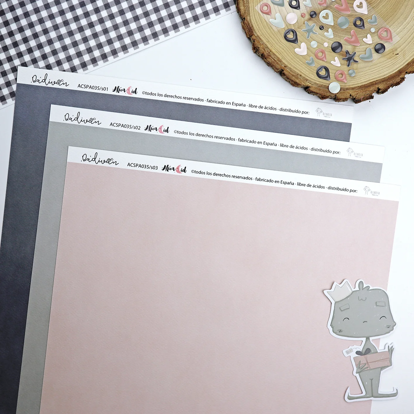 El set lleva 3 papeles sólidos con una cara lisa y la otra Vichy, y 3 papeles que llevan una cara sólida y la otra con textura.