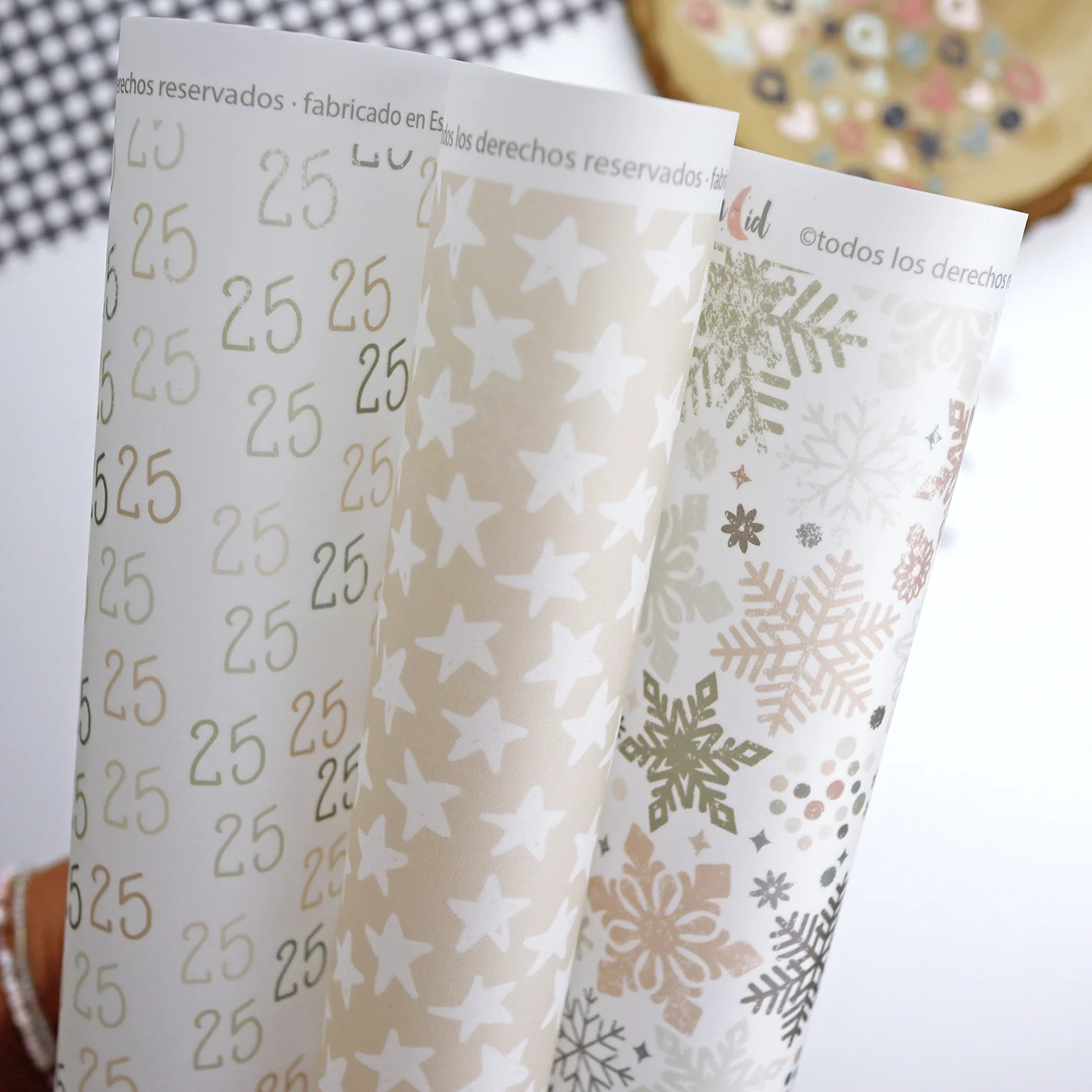 Los papeles son de 12×12″ (30,5×30,5cm), aunque tienen más tamaño al alto, donde incluyo los códigos o información del papel.