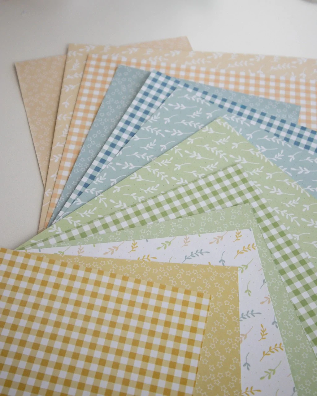 - 12 hojas de papel doble faz con diseños básicos, perfectos para tus proyectos de scrapbooking.