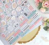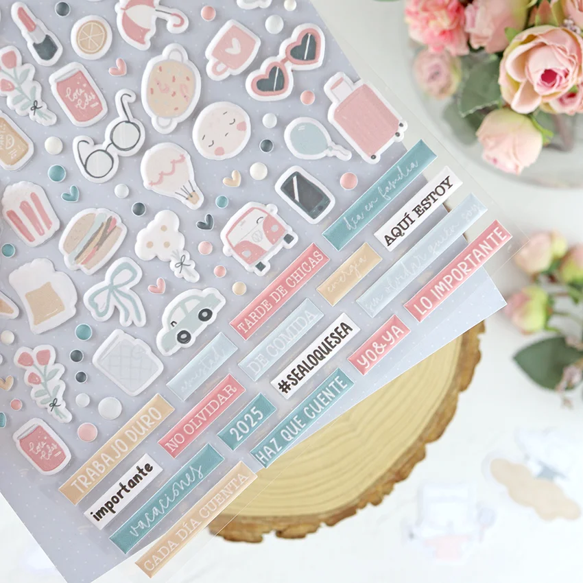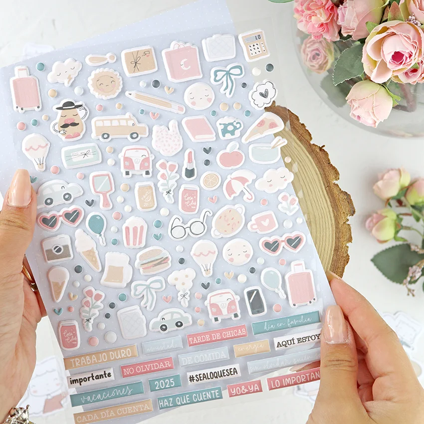El set de pegatinas Sea lo que sea incluye pegatinas acolchadas e impresas y troqueladas, con un montón de ilustraciones y etiquetas para alegrar tus libretas, agendas y diarios más cuquis.