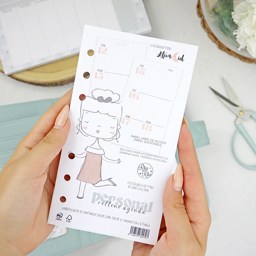 El relleno está impreso en papel sostenible de 100 gr, en tamaño PERSONAL de 9,5×17,1 cm, y el interior se distribuye así: