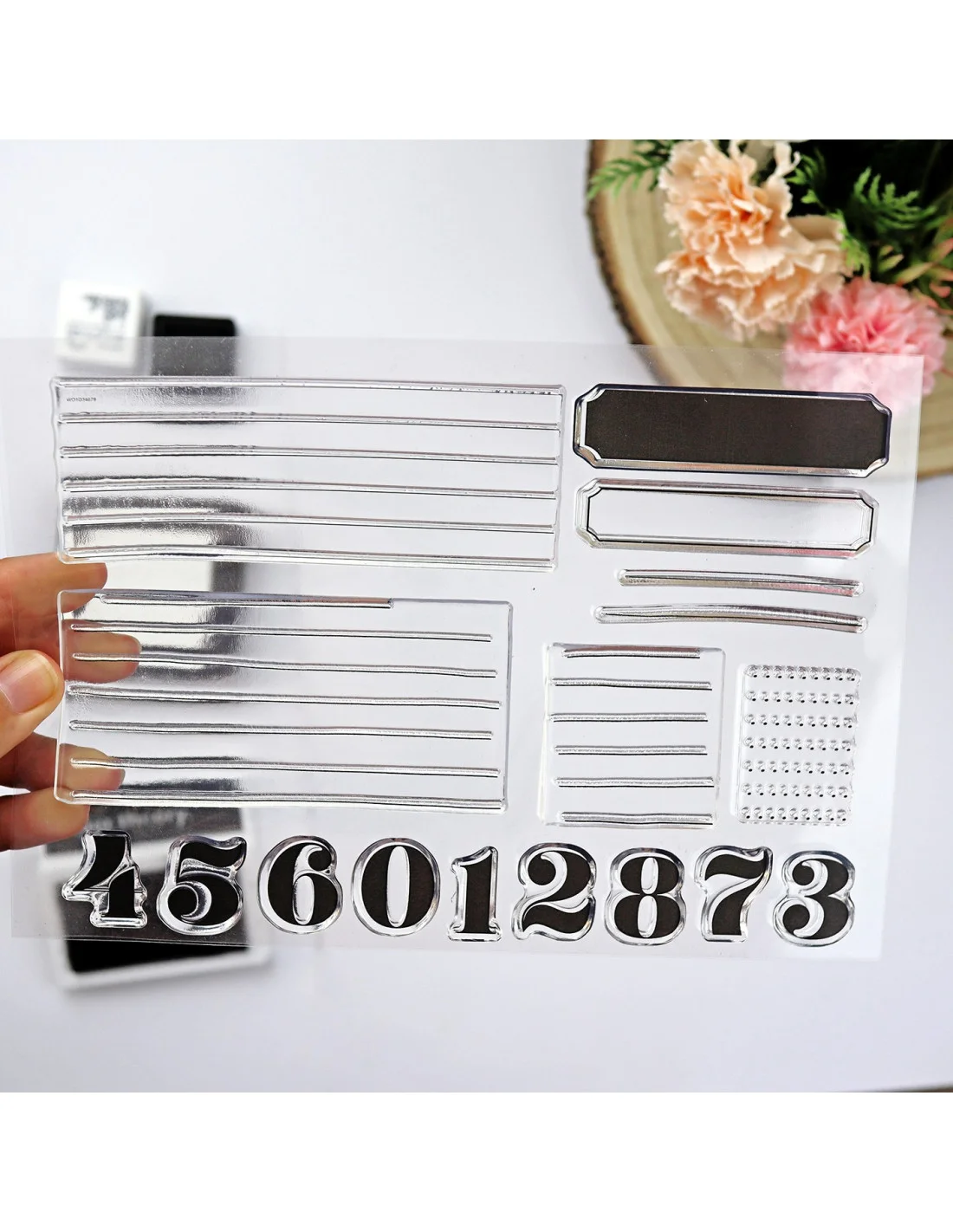 Lleva números y diseños con líneas y punteados que permiten crear un patrón sobre el que escribir. También incluye una etiqueta para estampar en positivo y negativo.