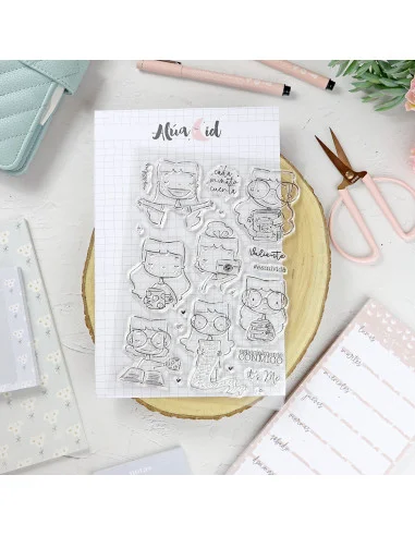 Contiene 20 piezas, 7 de ellas son muñecas de un tamaño aproximado entre 6 y 7,5 cm, y los 13 sellos restantes son frases e ilustraciones pequeñitas.