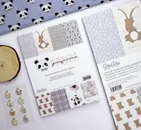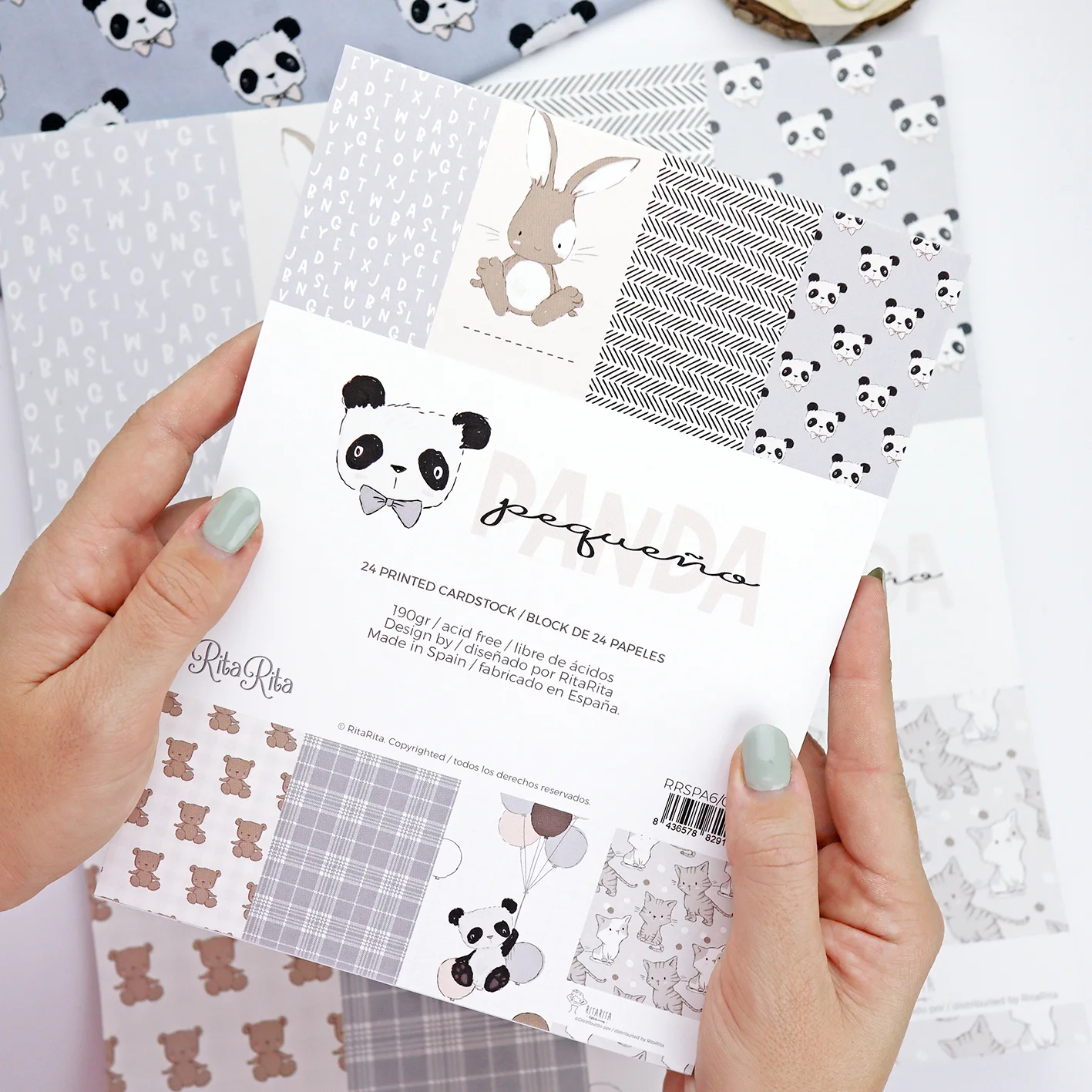 El bloc pequeño Panda azul para scrapbooking está encolado por la parte superior e incluye 24 papeles de scrapbooking, impresos a una cara, en 190gr.