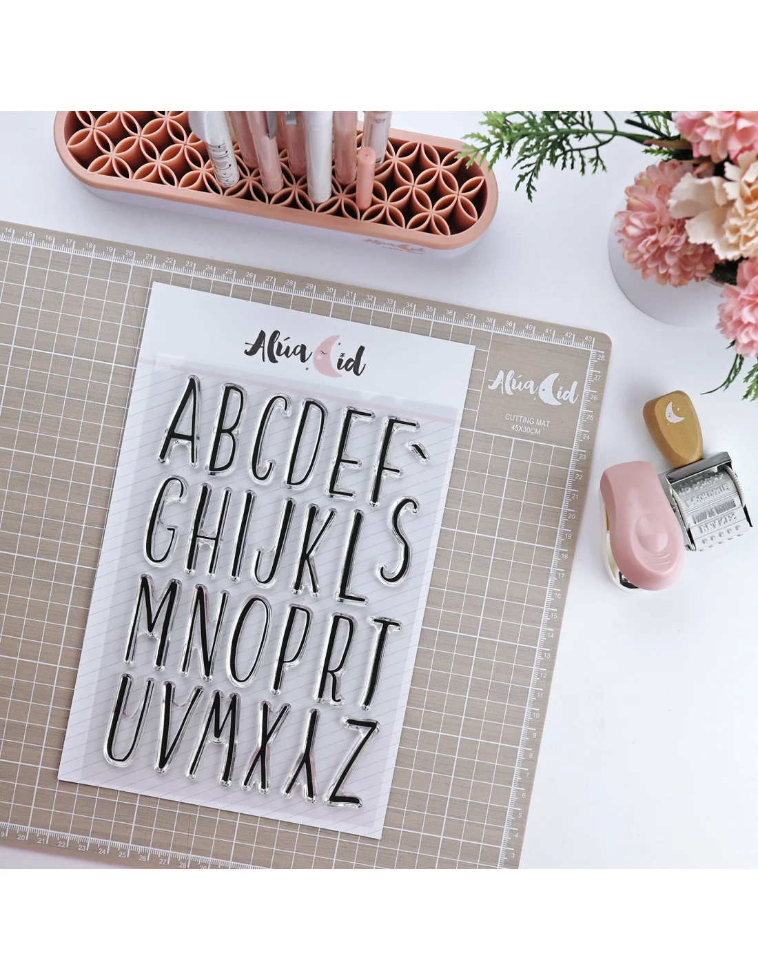 Set de sellos ABC Pols para usar en la agenda, bullet journal, libreta de notas o álbum de fotos. Incluye 26 sellos con el abecedario completo en mayúsculas, así como una tilde de puntuación.